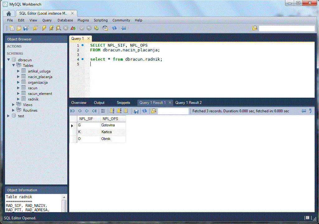 Naš zadatak je da savladamo dio SQL jezika za izvodjenje upita. Alat u kojem će se izvoditi primjeri je SQL Editor, koji se dobije u paketu za instalaciju baze MySQL (sa sledećeg site-a se može preuzeti instalacija http://dev.mysql.com/downloads/)